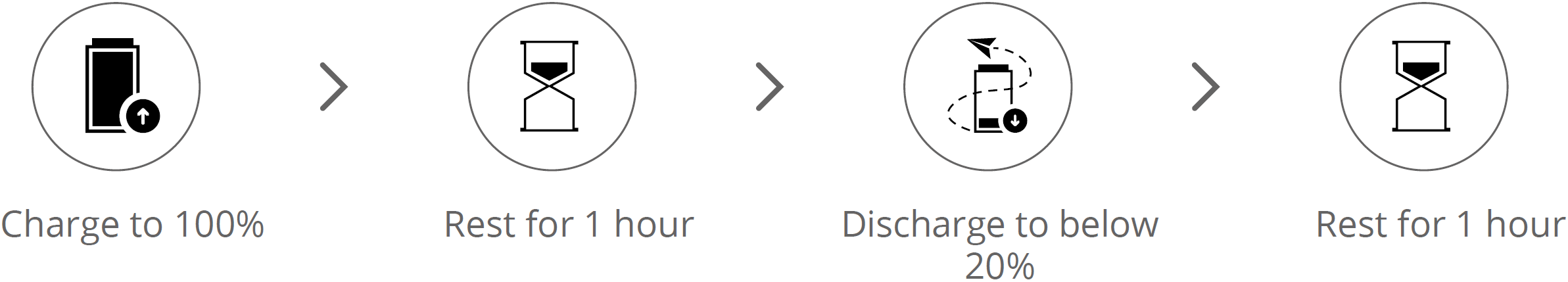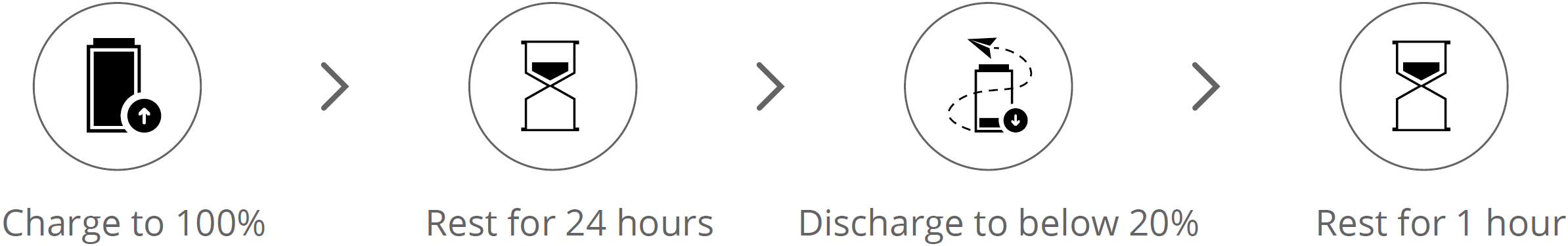 Проводите обслуживание батареи каждые 50 циклов или 3 месяца, или когда DJI Pilot 2 выдаст соответствующее сообщение, выполнив следующие шаги: