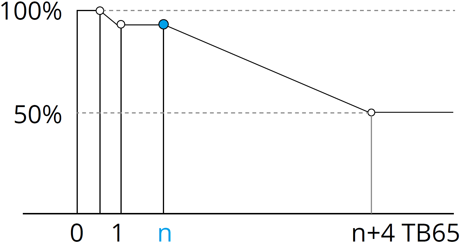 Полностью заряженная батарея самостоятельно разряжается до 95% в первые 12 часов. Второй период саморазряда начинается со второго дня (по умолчанию, можно настроить в DJI Pilot 2) и снижает заряд до 50% для продления срока службы. Стратегия саморазряда показана ниже.