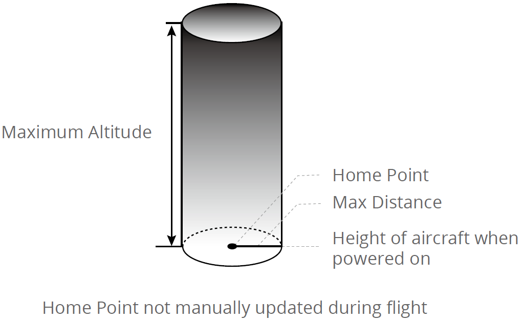 Ограничение максимальной высоты полета ограничивает высоту полета аппарата, а ограничение максимального расстояния полета ограничивает радиус полета аппарата вокруг точки взлета. Эти лимиты можно установить с помощью приложения DJI Pilot 2 для повышения безопасности полета.