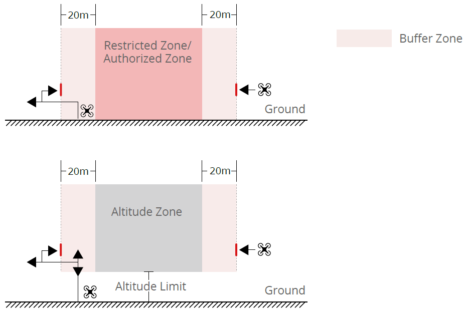 Буферные зоны для Высотных зон: буферная зона шириной около 20 метров создается снаружи каждой Высотной зоны. Как показано на иллюстрации ниже, при приближении к буферной зоне Высотной зоны в горизонтальном направлении, аппарат будет постепенно снижать скорость полета и зависать за пределами буферной зоны. При приближении к буферной зоне снизу в вертикальном направлении, аппарат может набирать и снижать высоту или лететь в направлении, противоположном Высотной зоне, но не может лететь в сторону Высотной зоны. Аппарат не может вернуться в буферную зону в горизонтальном направлении после ее покидания.