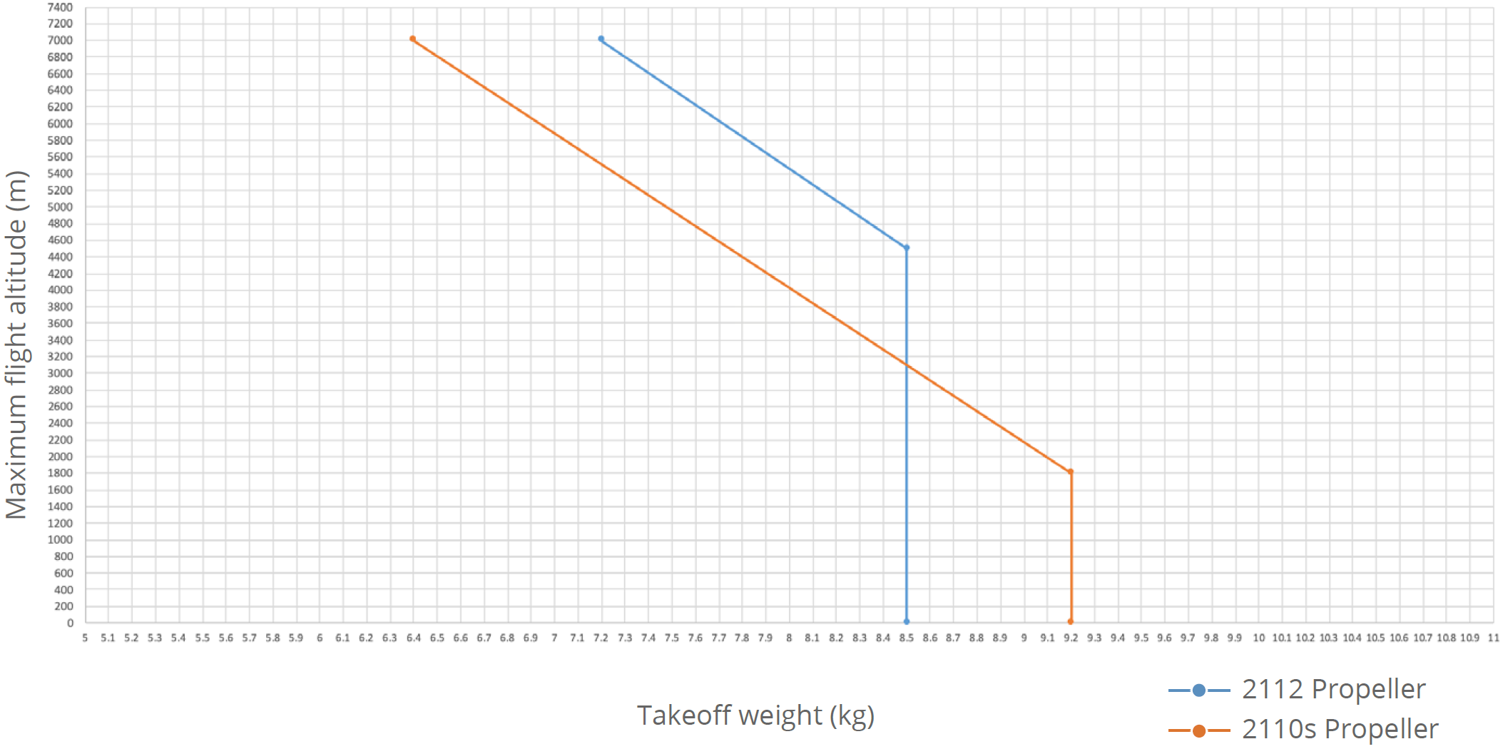 Ограничение высоты полета — это максимальная высота, на которой аппарат может нормально летать при скорости ветра не более 12 м/с. Обратите внимание, что способность аппарата к торможению и ускорению снижается вблизи предела высоты полета. Пожалуйста, ознакомьтесь со схемой ниже, чтобы узнать больше о выборе подходящих пропеллеров в зависимости от веса аппарата и ожидаемой максимальной высоты полета.