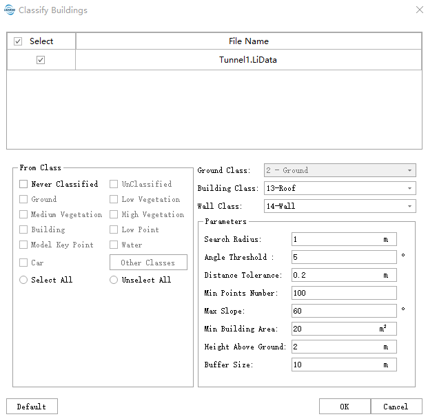 1. Для использования этой функции необходимо, чтобы облако точек уже прошло классификацию наземных точек.2. В исходных данных точки, отнесённые к категории «крыша» или «стена», не будут переклассифицированы.
