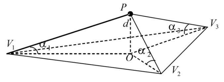- Процесс итеративной сгустки. Пройдитесь по всем неклассифицированным точкам, запросите треугольники, к которым относится каждая точка, в горизонтальной плоскости проекции. Рассчитайте расстояние (d) от точки до треугольника и максимальный угол между точкой и тремя вершинами треугольника. Как показано на рисунке ниже, расстояние и максимальный угол сравниваются с расстоянием итерации и углом итерации соответственно. Если они меньше соответствующего порогового значения, то точка классифицируется как наземная и добавляется в триангуляцию. Повторяйте этот процесс, пока не будут классифицированы все наземные точки.