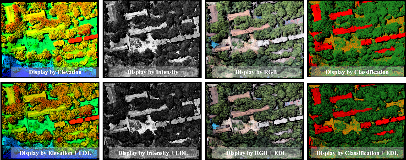 - Нажмите кнопку на панели инструментов. Визуальные эффекты данных облака точек в сцене будут улучшены в режиме EDL. На следующем изображении показано сравнение до и после использования режима отображения EDL.