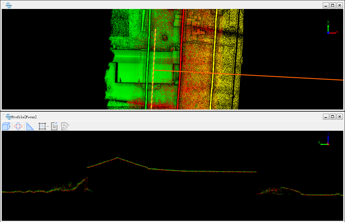 Когда профиль включен, окно облака точек не поддерживает функцию измерения. Окно профиля поддерживает выбор одной точки, выбор нескольких точек, измерение длины, измерение угла, измерение уклона и измерение высоты.