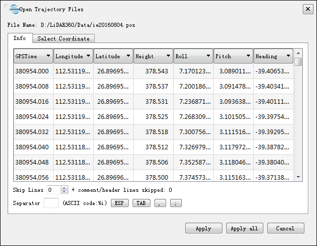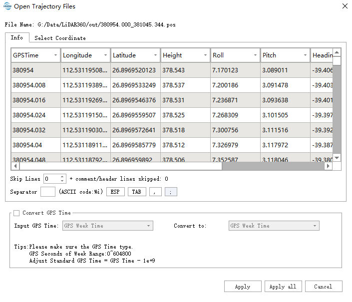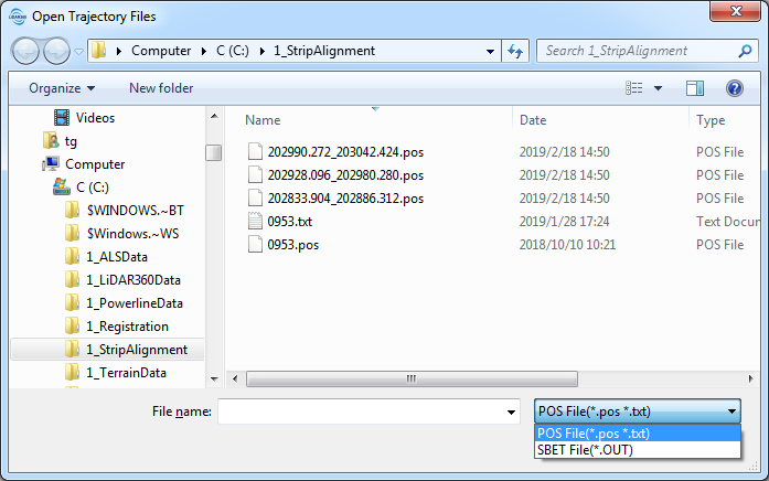 LiDAR360 поддерживает два формата файлов с траекториями: POS(*.pos) (файл в текстовом формате) и SBET(*.out)] (файл в двоичном формате).