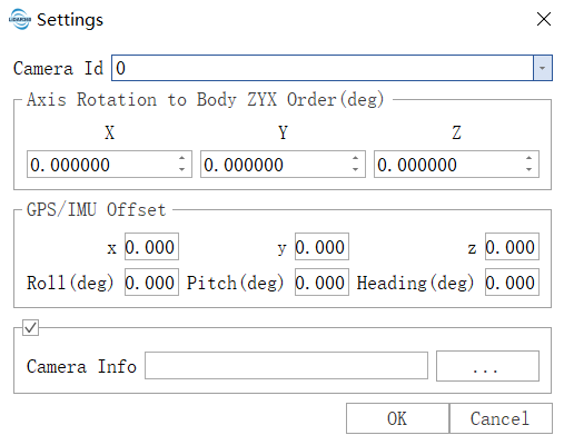 Данные визуализации и данные облака точек собираются синхронно и используют одну и ту же систему POS. С помощью настройки полосы одновременно корректируются траектория, угол установки камеры и элементы внешней ориентации. В файле проекта визуализации должны быть указаны начальный угол установки камеры, погрешность установки, положение, а также углы крена, тангажа и курса на момент получения изображения. Если эта информация не указана в проекте визуализации, ее можно задать в диалоговом окне настроек проекта визуализации.