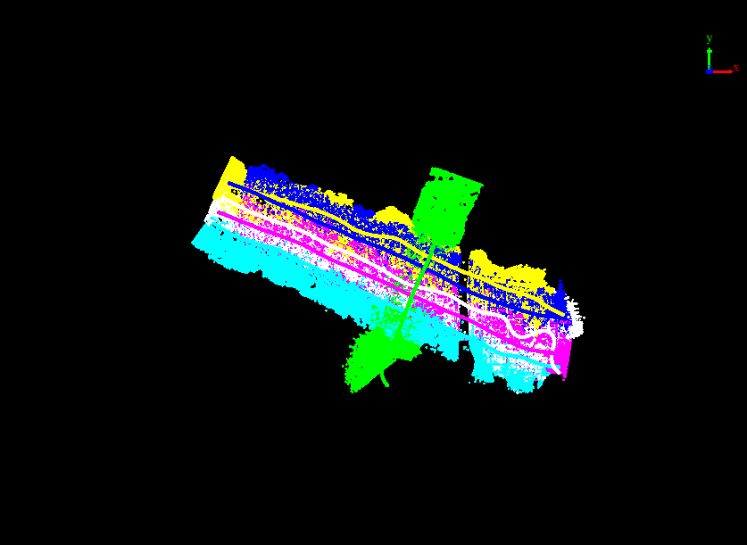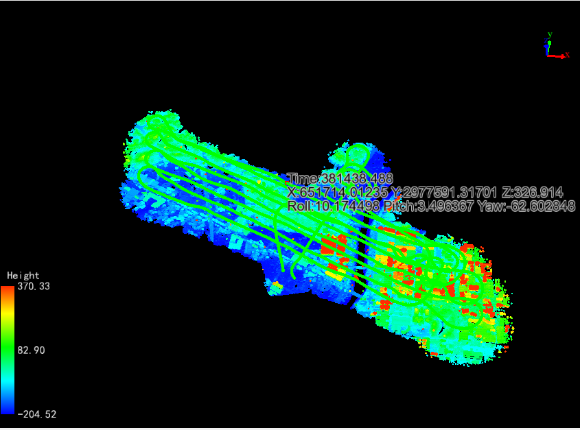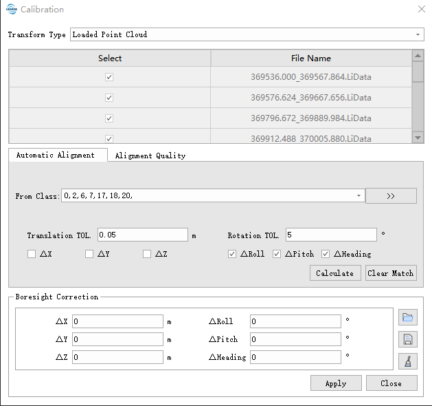 Примечание:1. Принцип сопоставления файла облака точек и траектории заключается в следующем: время GPS для всех точек в облаке точек находится в пределах временного интервала GPS для траектории.2. В большинстве случаев влияние X, Y или Z незначительно, в то время как наземные контрольные точки необходимы для более точной установки значения Z. Поэтому по умолчанию при настройке выбираются только крен, тангаж и курс.3. Результат может не удовлетворить пользователя, если файл с данными POS недостаточно точен. В этом случае пользователь может выполнить выравнивание вручную на основе полученного результата.4. Для функции Overlapped необходимы как минимум две пары сопоставленных облаков точек и траекторий.