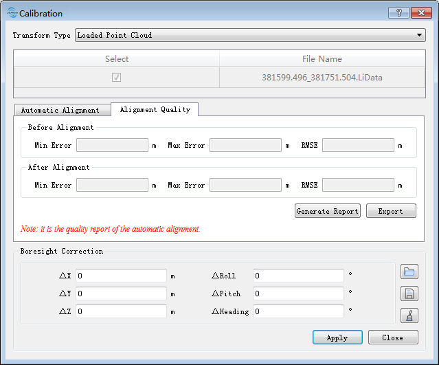 Автоматическое Выравнивание:Выберите ошибку прицеливания, которую нужно исправить, и установите допуск на смещение и допуск на поворот. Нажмите «Рассчитать», чтобы автоматически определить ошибку прицеливания. Результат отобразится в разделе «Коррекция прицеливания». Нажмите «Очистить сопоставление», чтобы удалить информацию о сопоставлении. После изменения соответствующих параметров пользователи могут снова рассчитать параметры выравнивания. После автоматического выравнивания LiDAR360 определит качество выравнивания. Качество выравнивания будет отображаться на вкладке «Качество выравнивания». Нажмите кнопку «Экспорт», чтобы сохранить информацию о качестве выравнивания, и нажмите кнопку «Создать отчет», чтобы создать отчет о качестве автоматического выравнивания. (Теория коррекции на основе автоматической настройки.)Ручное Выравнивание:Отрегулируйте погрешность прицеливания вручную. (Теория коррекции на основе ручного измерения.)Нажмите «Применить», и коррекция погрешности будет применена к выбранному Тип преобразования.