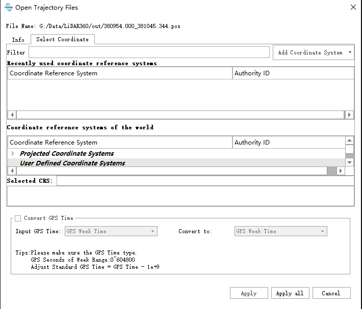 Необходимо выбрать правильную систему координат проекции, как показано на рисунке ниже.Пример файла POS 2. Если файл POS содержит информацию о GridX и GridY, пользователь должен указать следующие заголовки (время по GPS, долгота, широта, высота, угол крена, угол тангажа, угол рыскания, GridX и GridY) для столбцов данных. Пример показан ниже.