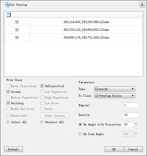 - По углу сканирования: если угол сканирования превышает пороговое значение, облако точек будет отнесено к избыточным точкам. (Примечание: эту функцию можно использовать только в том случае, если угол сканирования зафиксирован в облаке точек.)