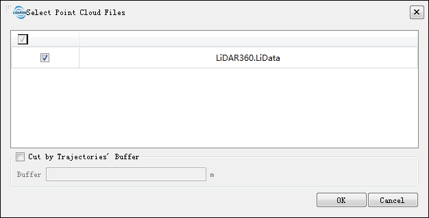 Выберите файлы с данными облака точек, которые нужно обрезать. Установите флажок «Обрезать по буферу траекторий» и задайте нужный параметр Буфер. -