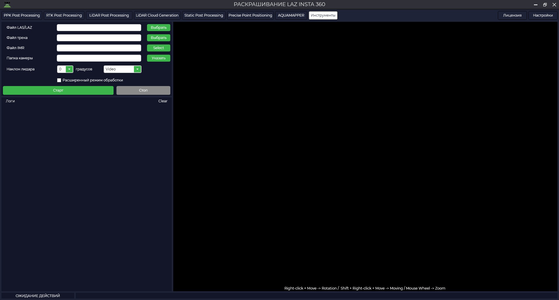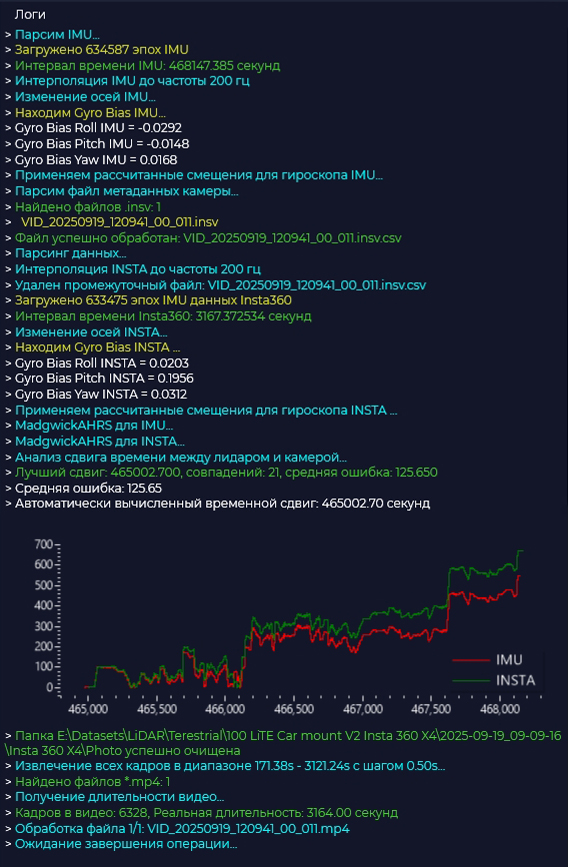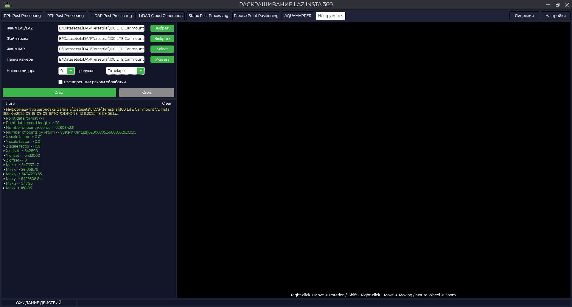 3. Раскрашивание облака точек: На финальном этапе, используя инструмент «Раскрашивание LAS/LAZ Insta 360», выполняется привязка RGB-значений к точкам облака. Алгоритм сопоставляет каждую точку лазерного отражения с соответствующим пикселом панорамных снимков, сделанных камерой Insta 360, на основе точной траектории и данных о положении камеры относительно лазерного сканера, что и обеспечивает реалистичное окрашивание в естественные цвета.