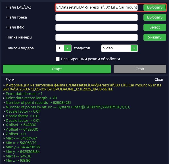 Выберите файл траектории в соответствующей проекции, полученный вместе с облаком точек из модуля «LiDAR Cloud Generation». Файл траектории содержит точные координаты и ориентацию сканирующей системы в каждый момент времени. Эти данные критически важны для временной и пространственной привязки кадров к точкам облака.