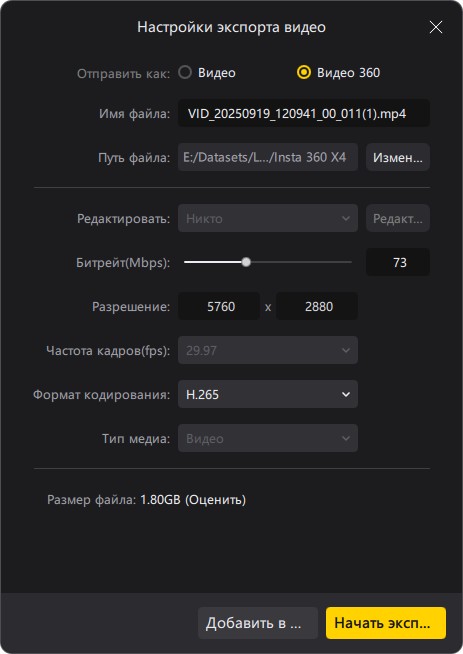 5. Инициируйте экспорт видеофайла, используя указанные ниже настройки в папку с исходными файлами *.lrv и *.insv