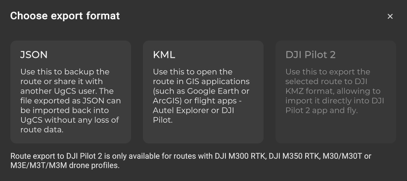 • DJI PIlot 2 — возможность экспортировать маршруты из UgCS в DJI Pilot 2 (формат KMZ / WPML). Теперь можно легко экспортировать любой маршрут, запланированный в UgCS, в DJI Pilot 2 и пролететь по нему на дронах, поддерживаемых в DJI Pilot 2: M300 RTK, M30 и Mavic 3 Enterprise.