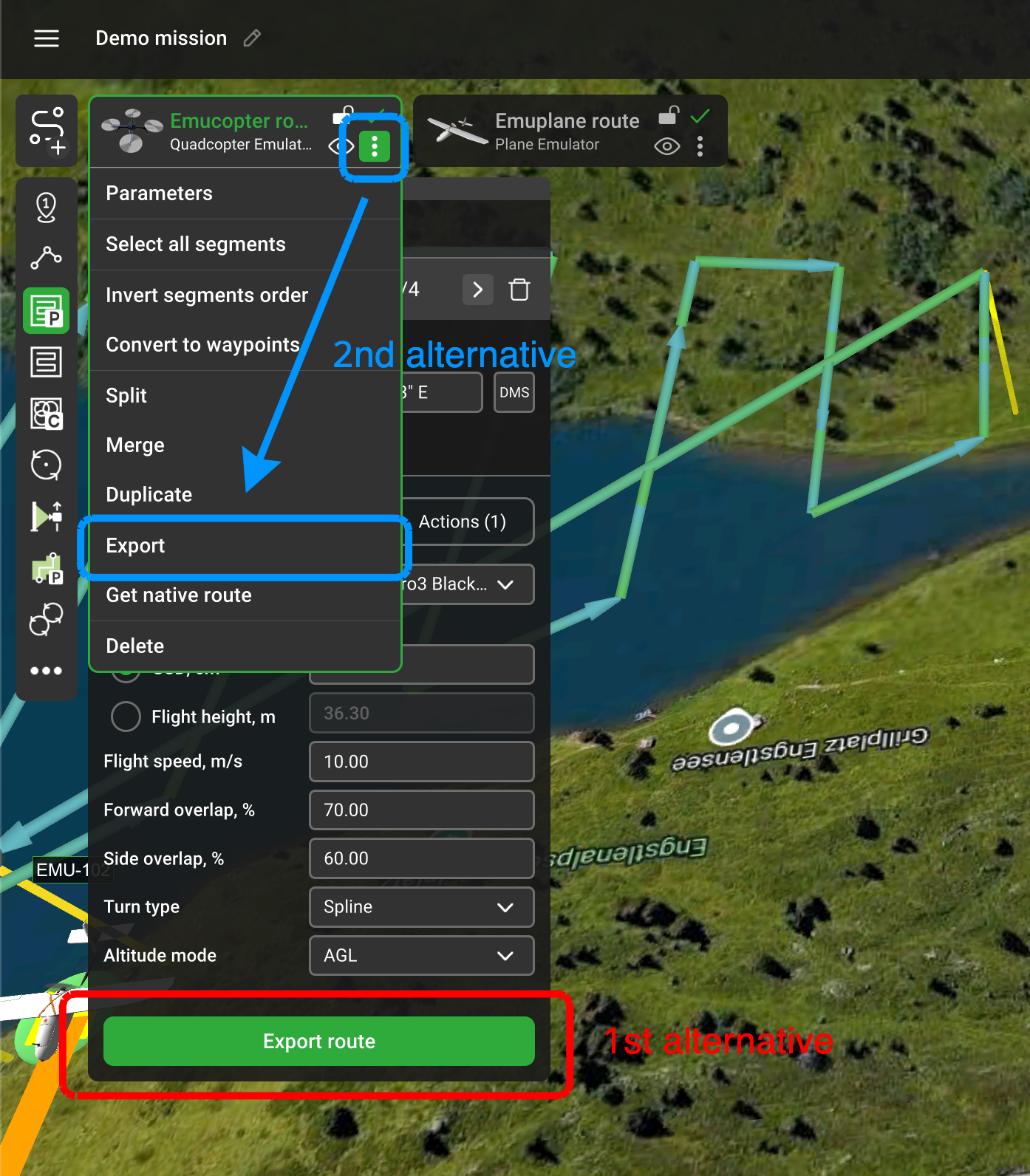 Чтобы воспользоваться функцией экспорта, нажмите «Экспорт…» в раскрывающемся меню любого маршрута и выберите вариант экспорта «DJI Pilot 2».