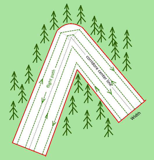Инструмент «Фотограмметрический коридор» или «Картографирование коридора» предназначен для проверки линейных объектов, таких как линии электропередач, дороги и реки. Для таких задач дроны могут быть оснащены фото- или видеокамерами. Инструмент охватывает заданный коридор с помощью датчика с определенным перекрытием (как спереди, так и сбоку). Высоту можно указать напрямую или рассчитать на основе настроек камеры — значения GSD. Коридор определяется с помощью следующих параметров: