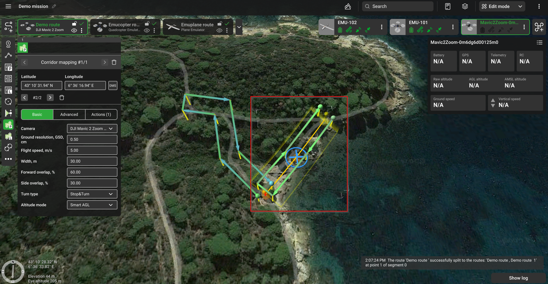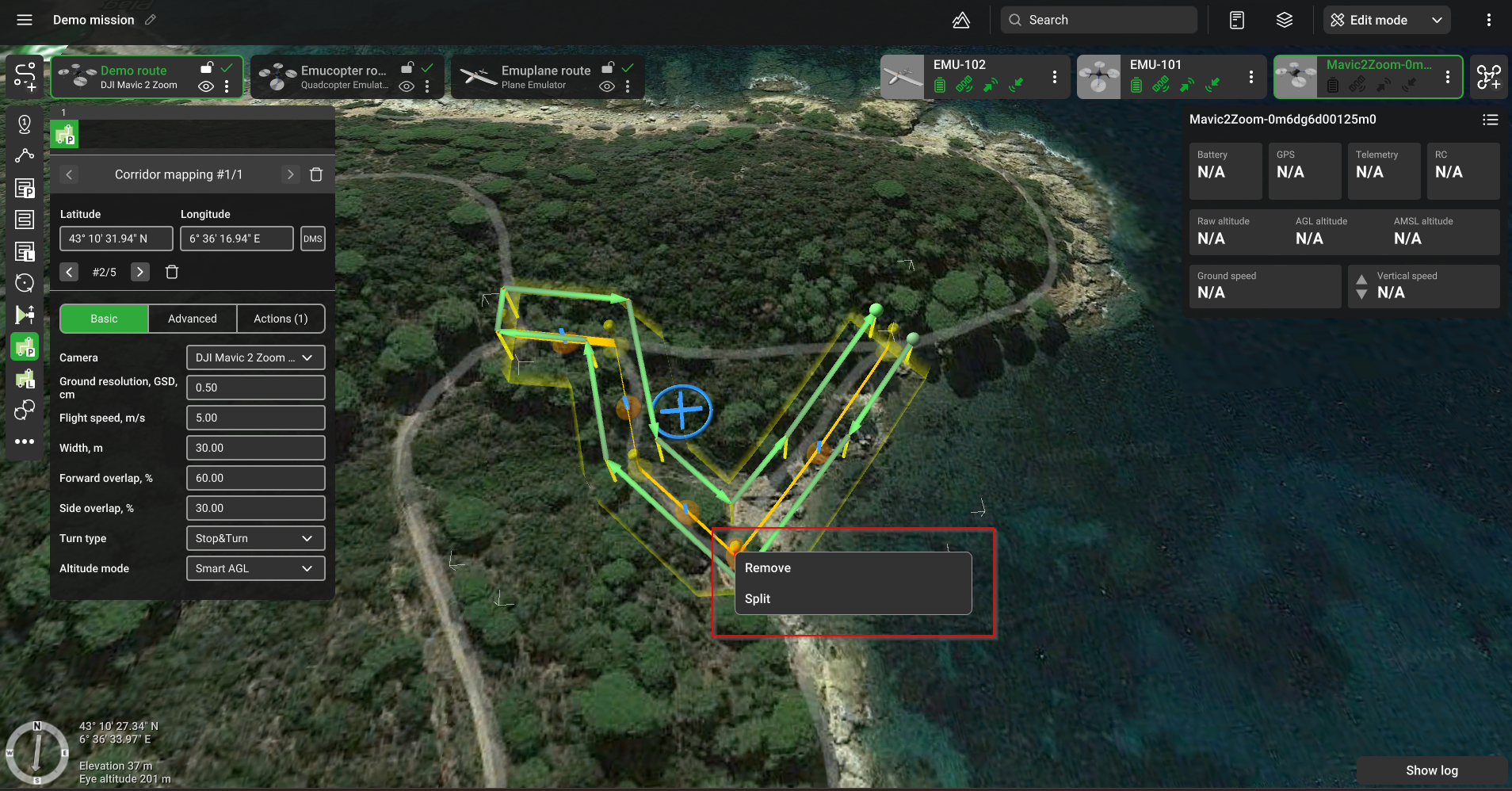 Чтобы разделить коридор, выберите путевую точку, в которой должна заканчиваться первая часть, нажмите правую кнопку мыши и выберите «Разделить».