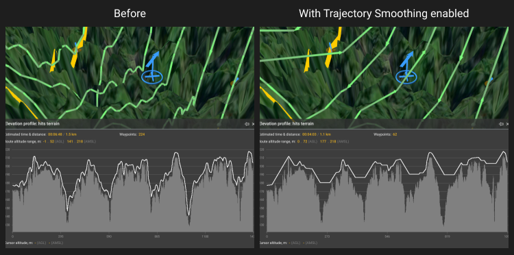 Допуск по высоте над уровнем земли — позволяет летать по прямой траектории над слегка холмистой местностью, задавая точность, с которой БПЛА должен придерживаться заданной высоты над уровнем земли. Для поддержания заданной высоты будут добавлены дополнительные путевые точки, если разница в высоте превышает допуск по высоте над уровнем земли. Чем меньше допуск по высоте над уровнем земли, тем больше будет добавлено путевых точек. Если допуск по высоте над уровнем земли равен 0 (нулю) высота БПЛА будет постоянной на протяжении всего маршрута, но будет добавлено много дополнительных путевых точек.