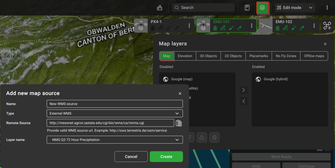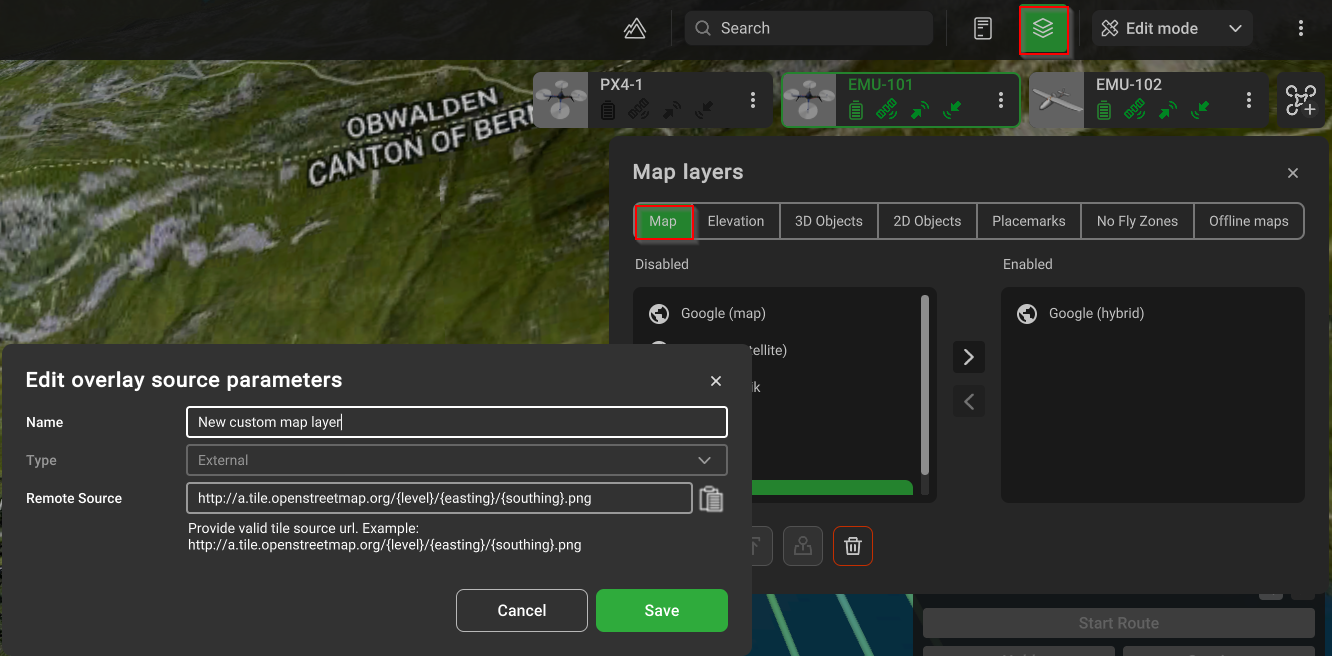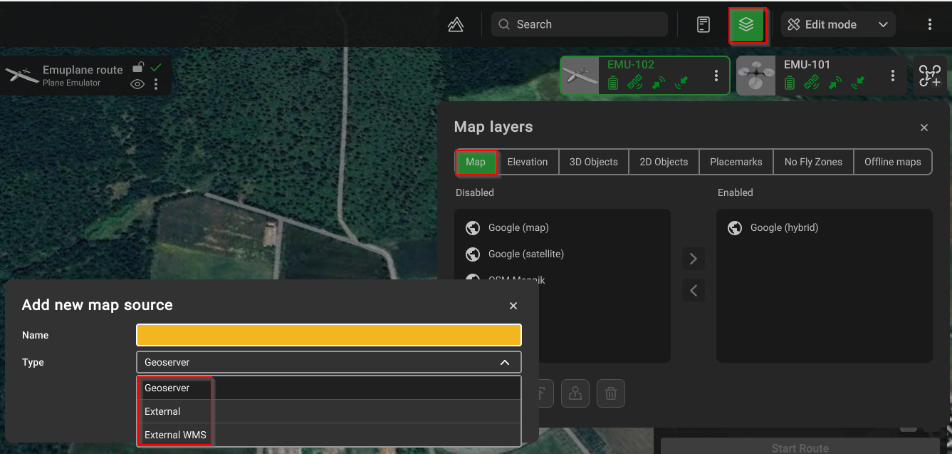 UgCS позволяет добавлять пользовательские слои карты в виде внешнего URL-адреса, источника WMS или ортофотоизображений, управляемых Geoserver.