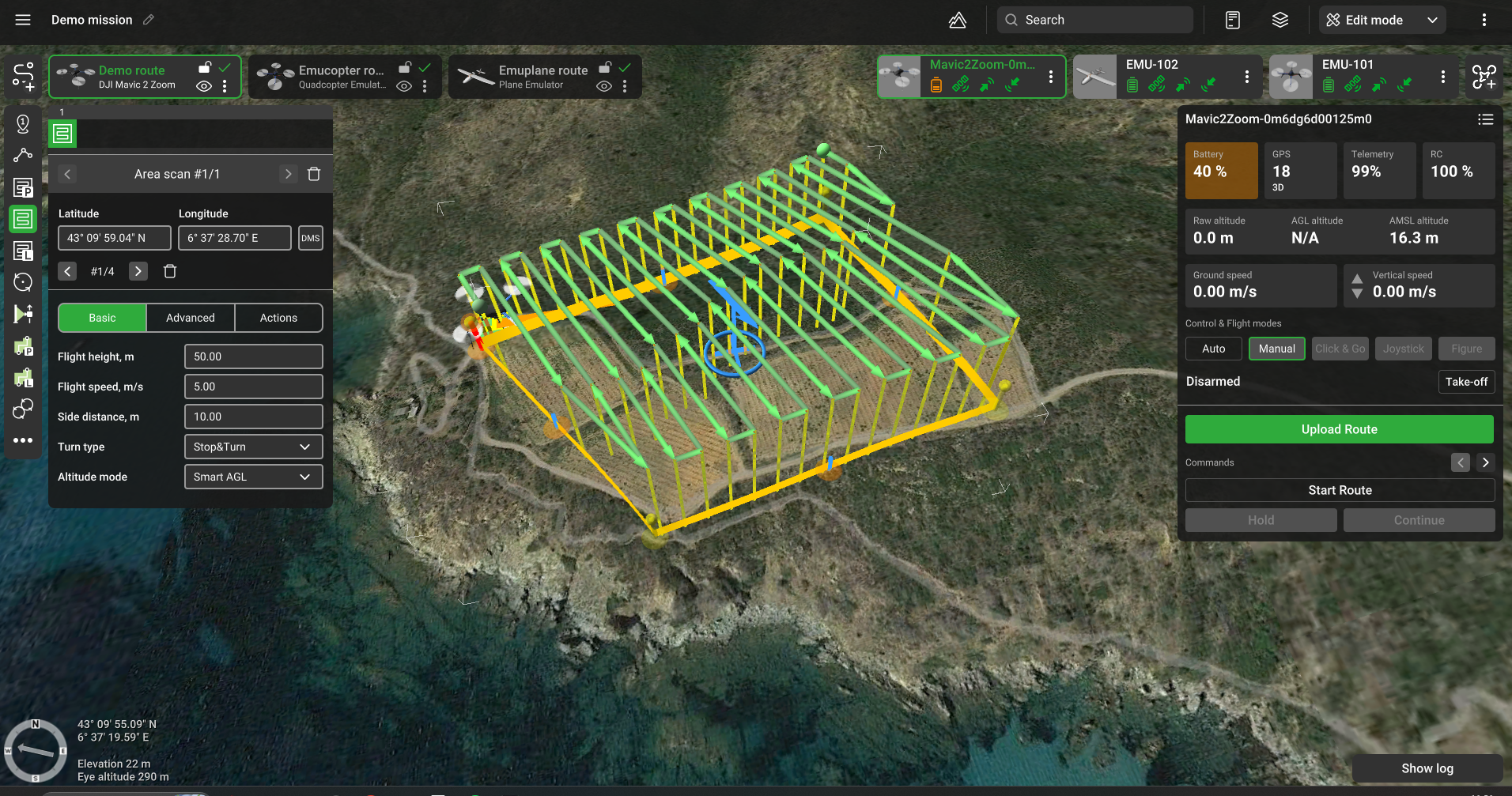 Допуск по высоте над уровнем земли (м) — позволяет летать по прямой траектории над слегка холмистой местностью, задавая, насколько точно БПЛА должен следовать заданной высоте над уровнем земли. Для поддержания заданной высоты будут добавлены дополнительные путевые точки, если разница в высоте превышает допуск по высоте над уровнем земли. Чем меньше допуск по высоте над уровнем земли, тем больше будет добавлено путевых точек. Если допуск по высоте над уровнем земли равен 0 (нулю), высота БПЛА будет постоянной на протяжении всего маршрута, но будет добавлено много дополнительных путевых точек.