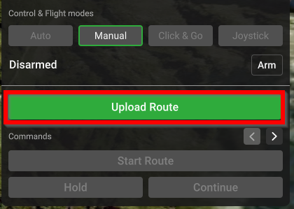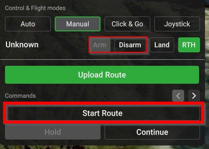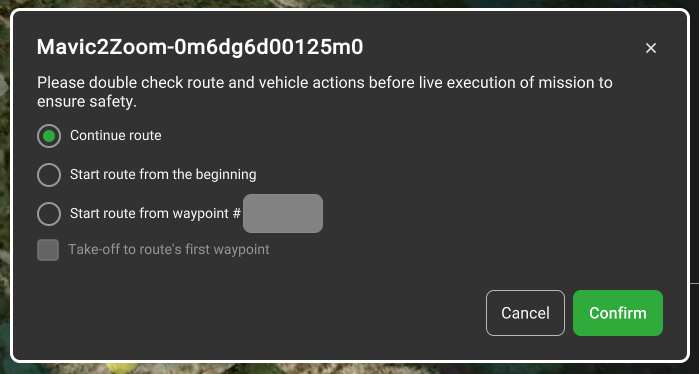 • Начать маршрут с путевой точки #. Эта опция отправит дрон к указанной путевой точке маршрута, с которой он продолжит выполнение миссии.